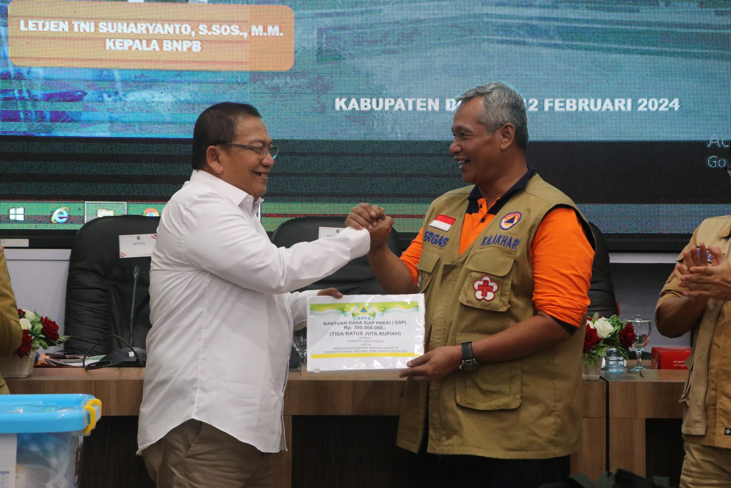 Penyerahan diserahkan secara langsung oleh Kepala BNPB Letjen TNI Suharyanto S.Sos., M.M kepada Bupati Demak dr. Hj. Eisti’anah, S.E di Grhadika Bina Praja, Senin (12/02/2024).