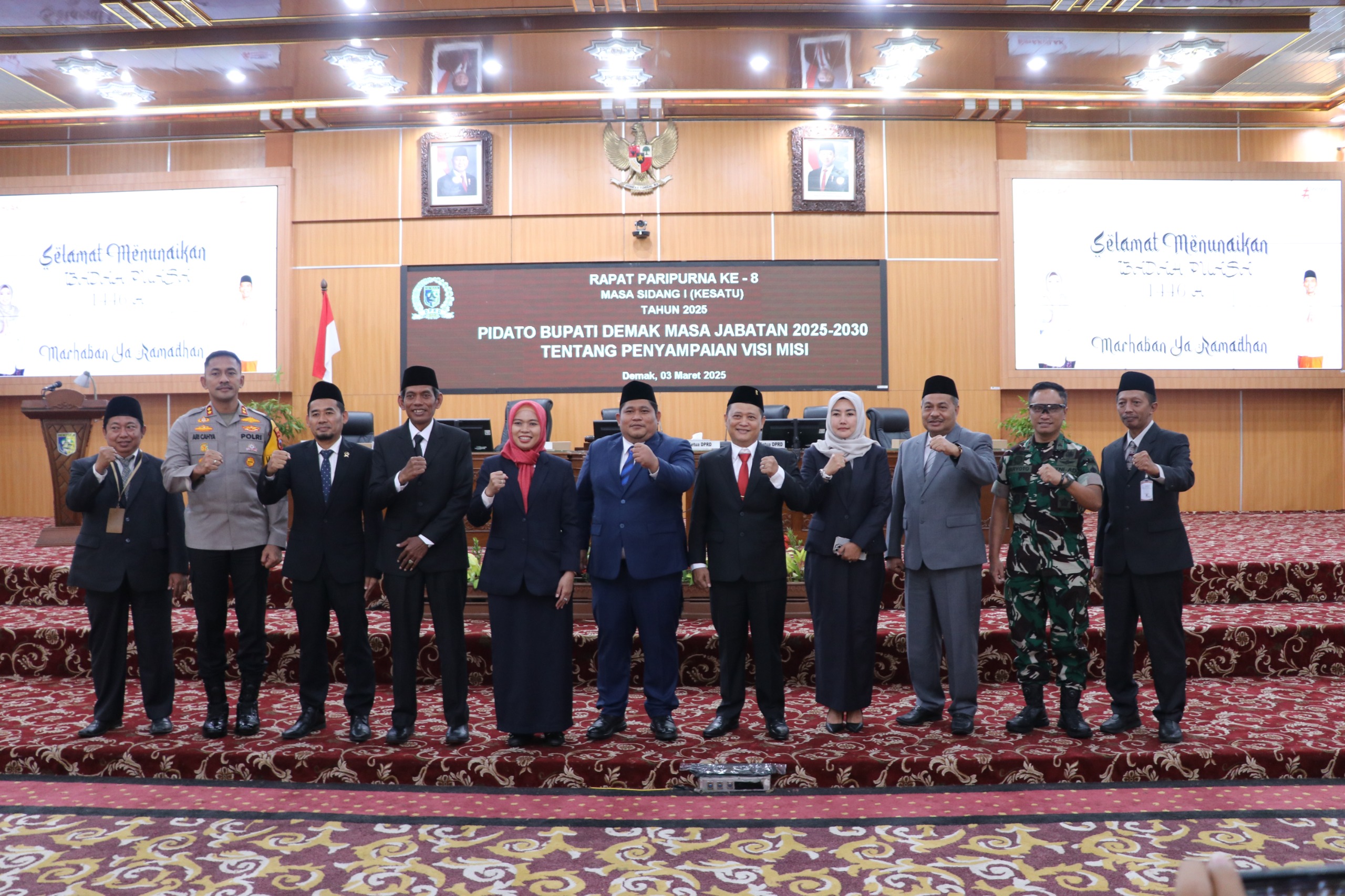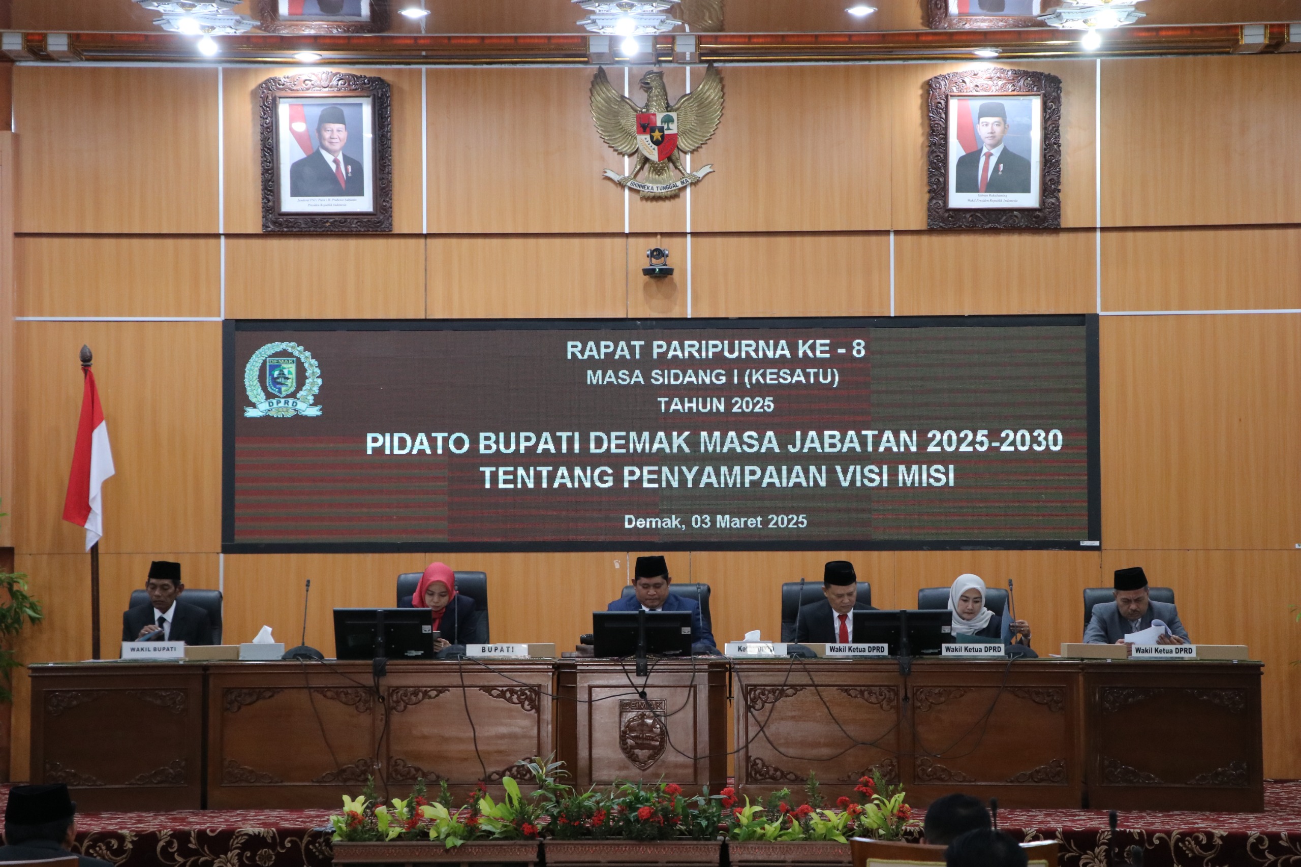 Dalam Rapat Paripurna DPRD Kabupaten Demak ke-8 Masa Sidang I Tahun 2025, yang digelar pada Senin (3/3), Bupati dan Wakil Bupati, dr. Hj. Eisti’anah, S.E. dan Muhammad Badruddin, M.Pd., secara resmi menyampaikan visi, misi, dan program unggulan mereka untuk periode 2025-2030. Acara yang berlangsung di Ruang Rapat Paripurna DPRD Kabupaten Demak ini dihadiri oleh sejumlah pejabat penting, termasuk Ketua DPRD, Dandim, Kapolres, Ketua Pengadilan Negeri, Wakil Ketua DPRD, serta kepala dinas dan camat se-Kabupaten Demak. Dalam pidatonya, Ketua DPRD, H. Zayinul Fata, S.E, memberikan apresiasi atas partisipasi aktif masyarakat dalam Pemilihan Kepala Daerah (Pilkada) 2024 dan menyampaikan harapan agar Bupati dan Wakil Bupati dapat melibatkan seluruh elemen masyarakat dalam pembangunan daerah.