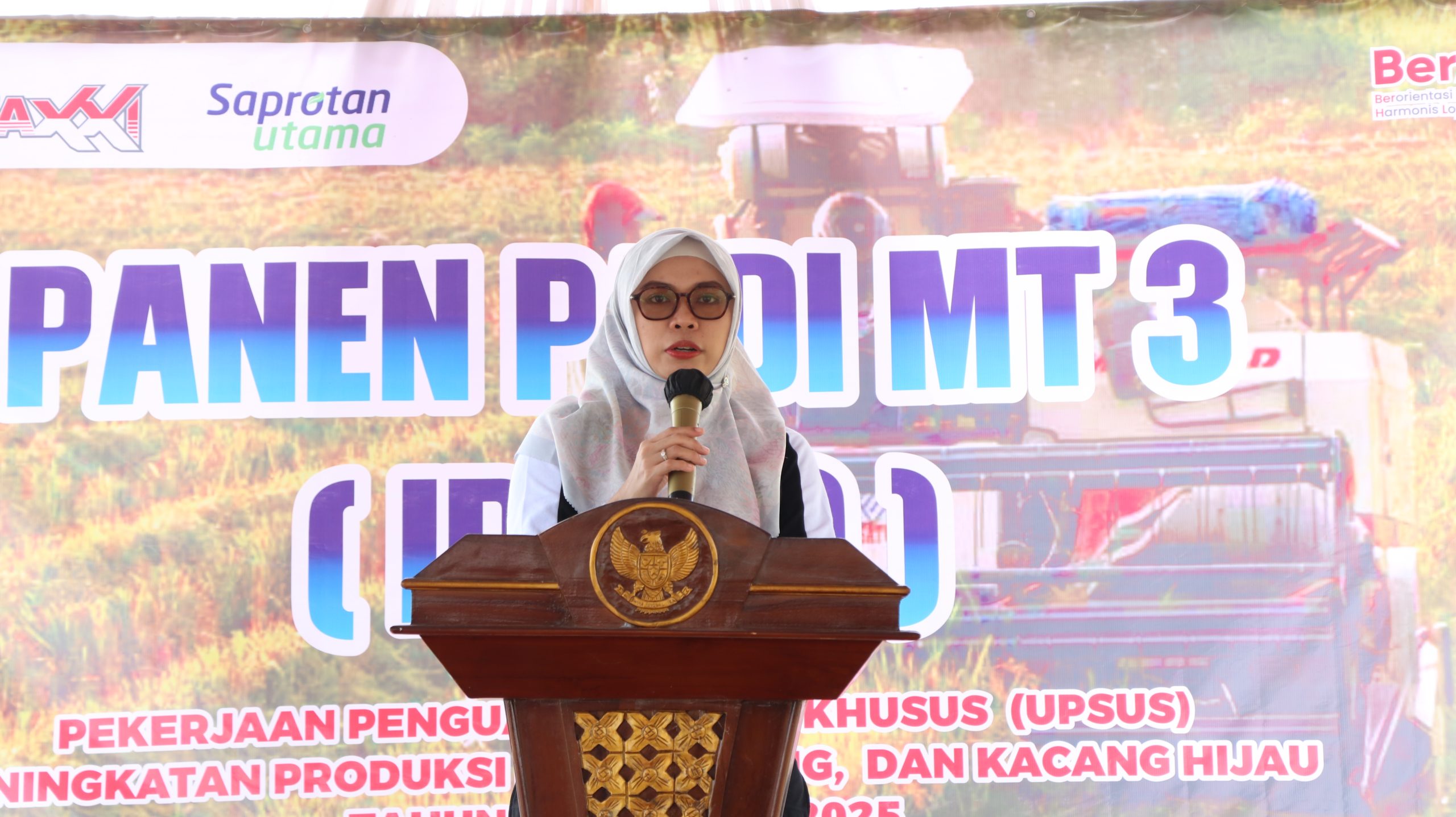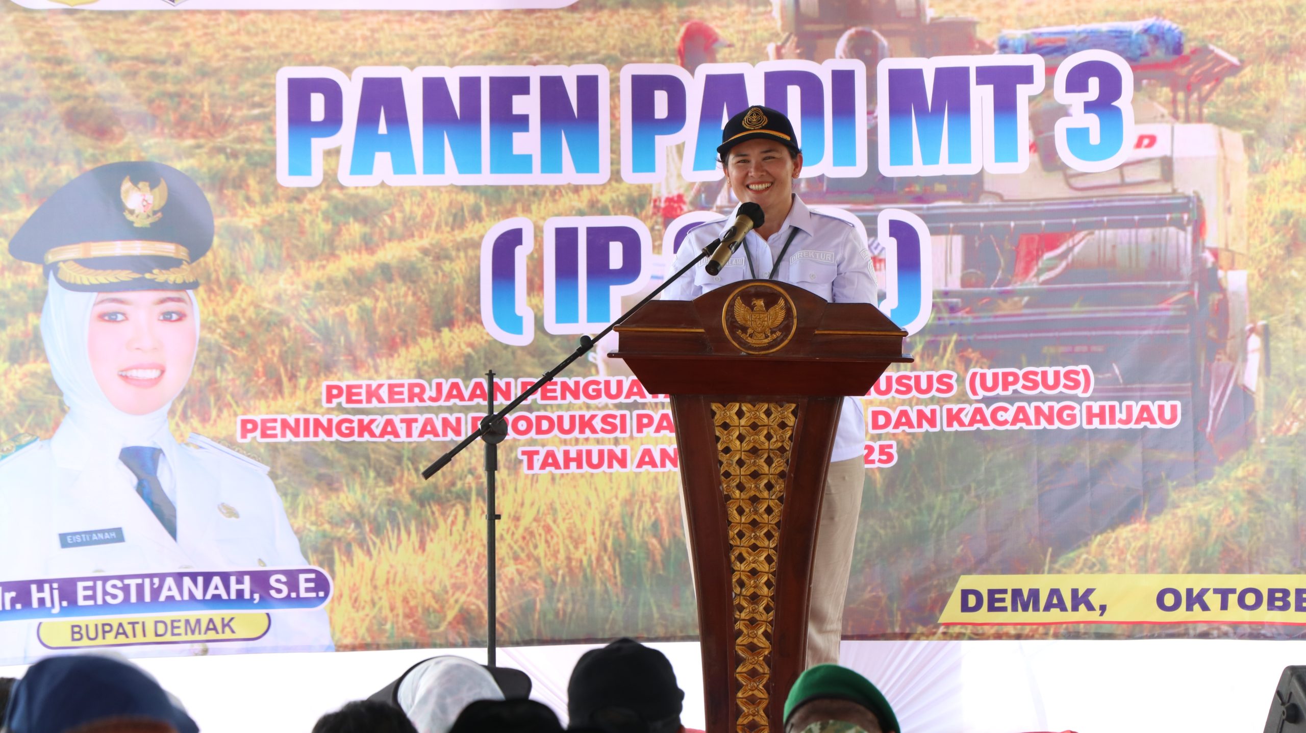 Panen padi tiga kali dalam setahun ini menjadi bukti nyata kemajuan teknologi dan inovasi pertanian di Kabupaten Demak. Hal tersebut disampaikan Bupati Demak Eisti’anah dalam kegiatan Panen Padi Perdana Musim Tanam 3 (IP 300) Untuk Swawembada Pangan Kabupaten Demak di Lahan Sawah Kelompok Tani Bangun Tani Desa Kendaldoyong, Kec. Wonosalam, Jumat (24/10/2025).
