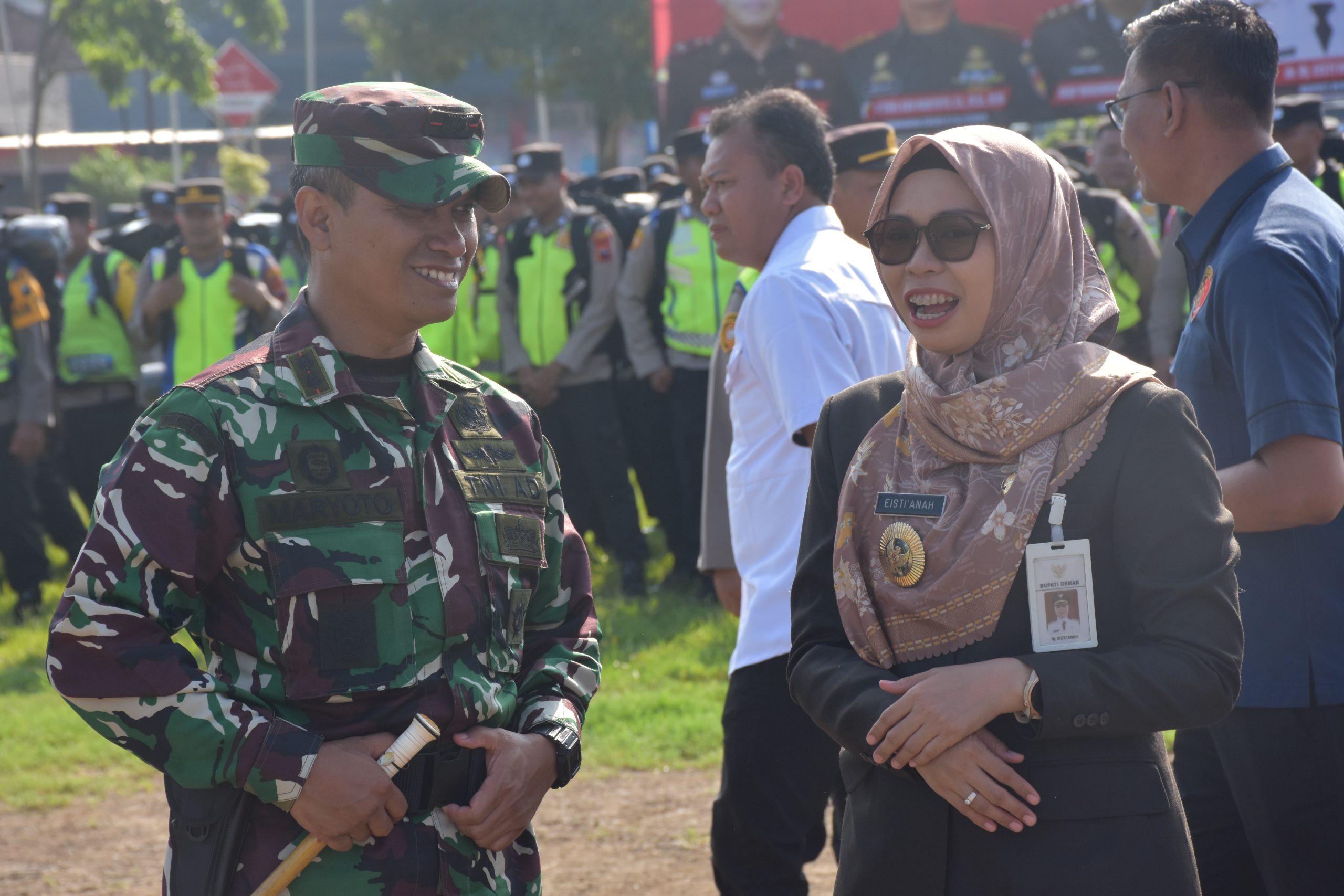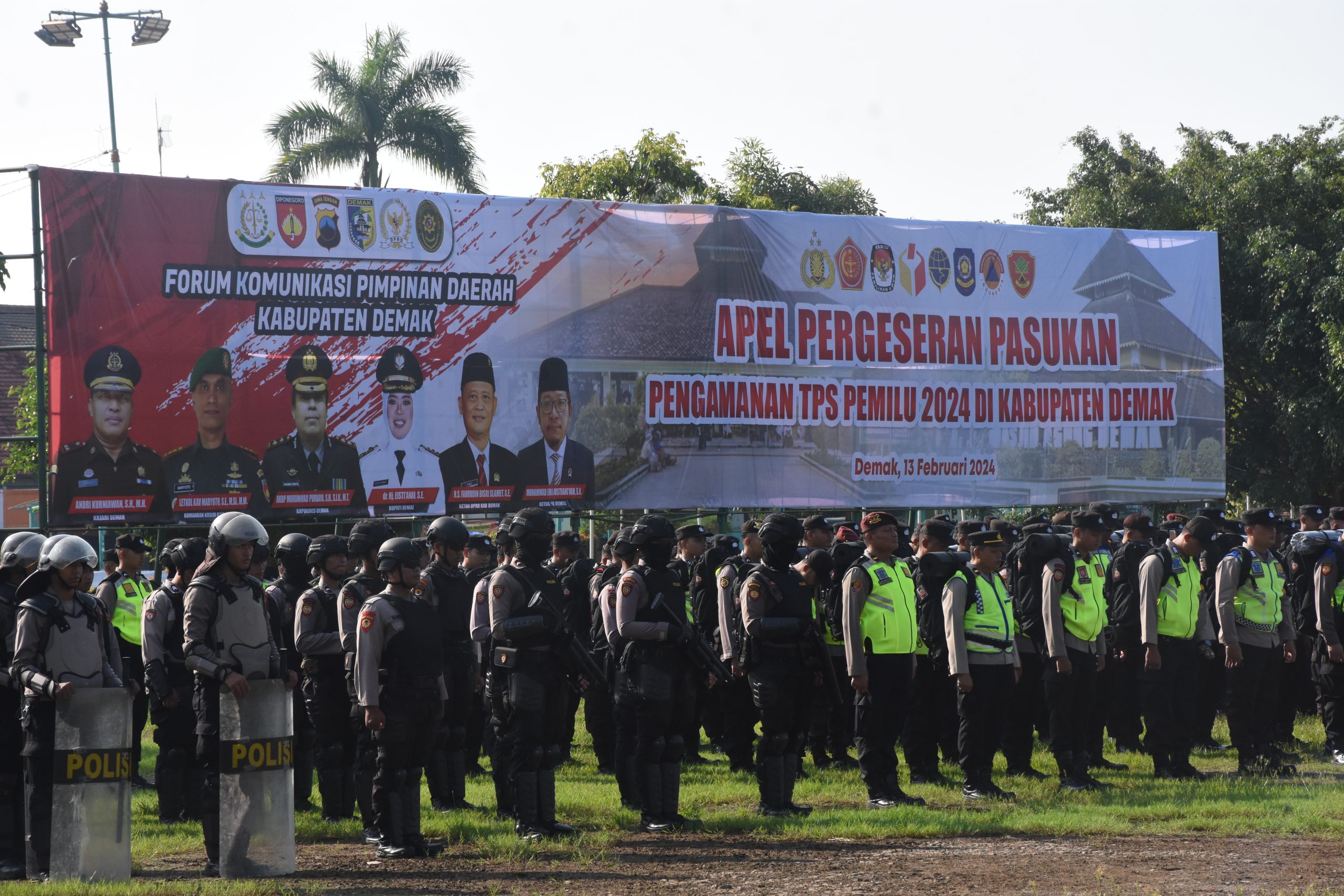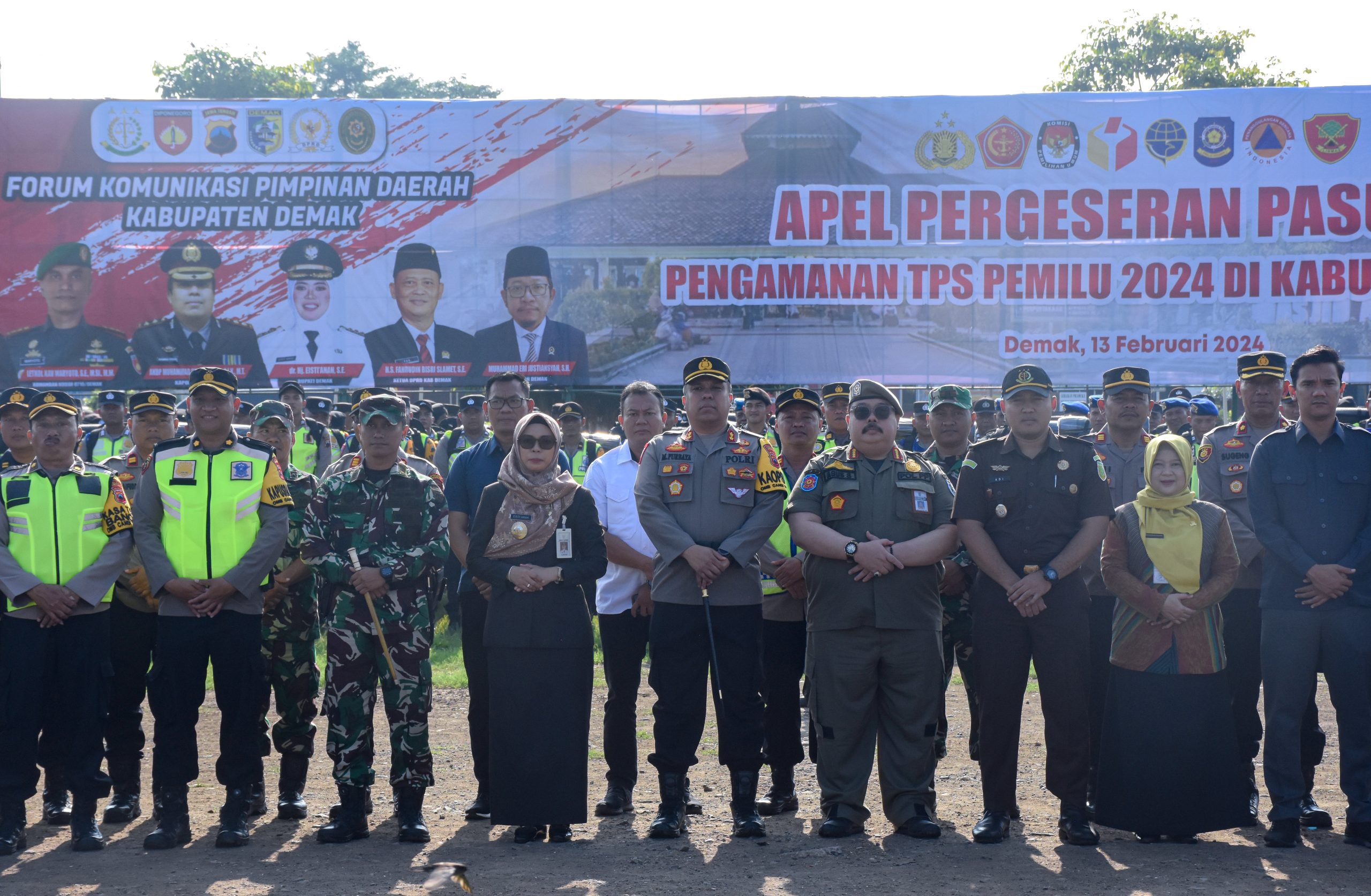 Bupati Demak Eisti’anah memimpin Apel Pergeseran Pasukan Pengamanan TPS Pemilu 2024, yang di gelar di alun alun Demak, Selasa (13/2/24).