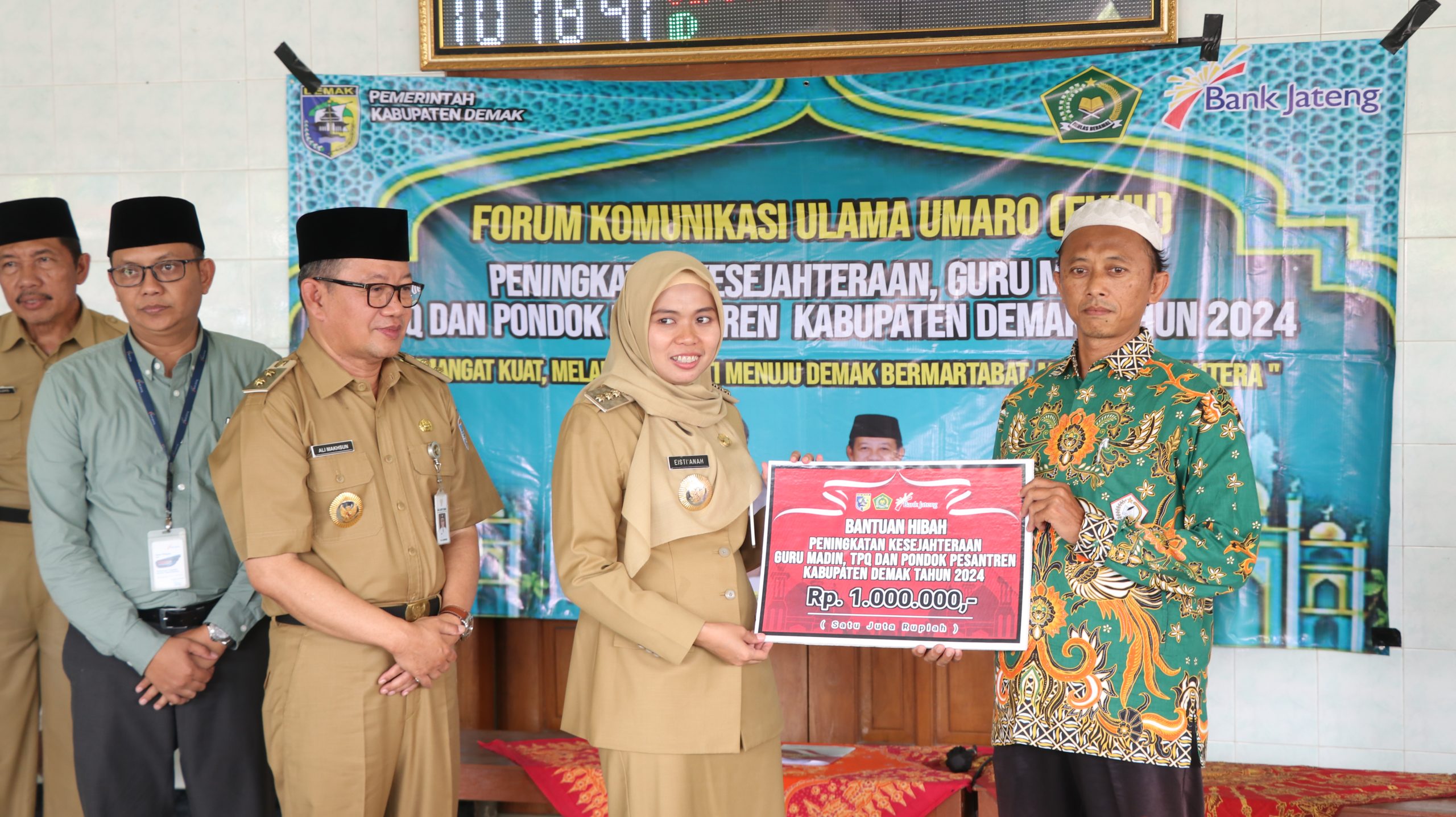 Bantuan diserahkan secara simbolis oleh Bupati Demak Eisti’anah, Wakil Bupati Ali Makhsun, dan Staf Ahli Setda kepada Guru Madin dan TPQ.