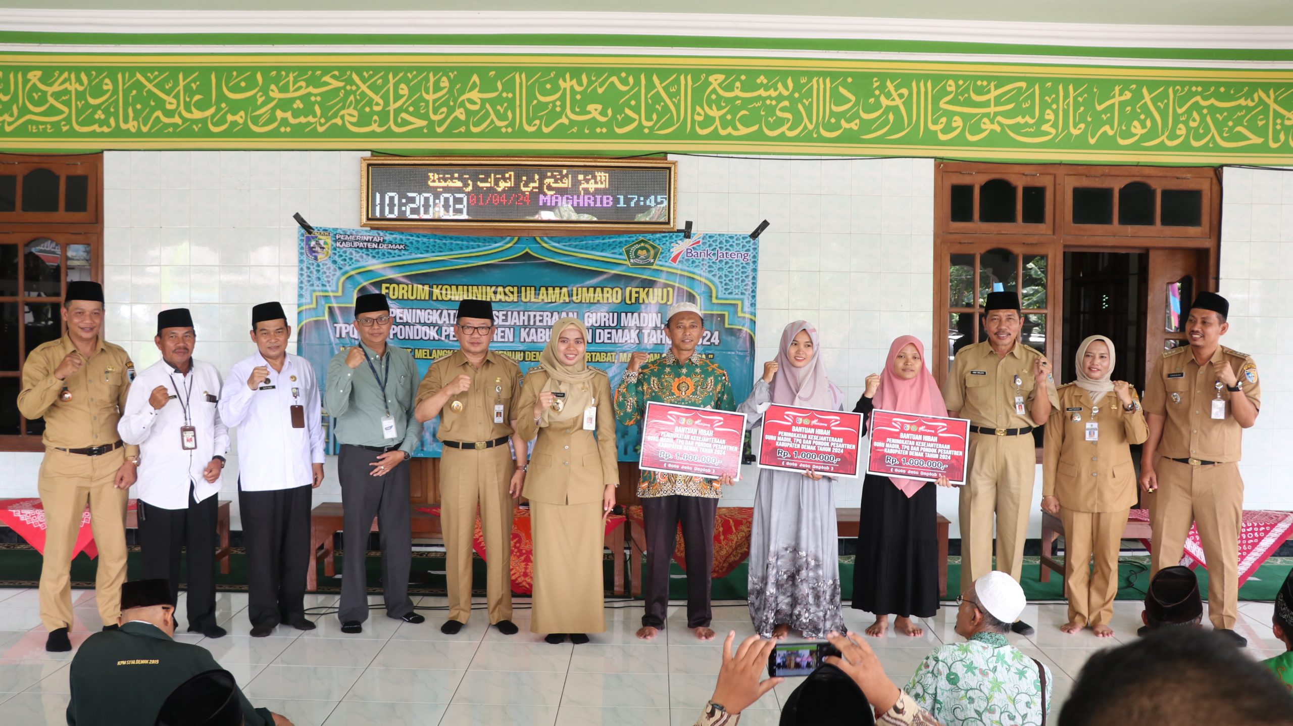 Pemerintah Kabupaten (Pemkab) Demak menyalurkan bantuan peningkatan kesejahteraan Guru Madrasah Diniyah (Madin), Taman Pendidikan Qur’an (TPQ) dan Pondok Pesantren (Ponpes) di Madin Miftahul Ulum Dukuh Lengkong, Desa Donorejo, Kec. Karangtengah, Senin (01/04/2024).