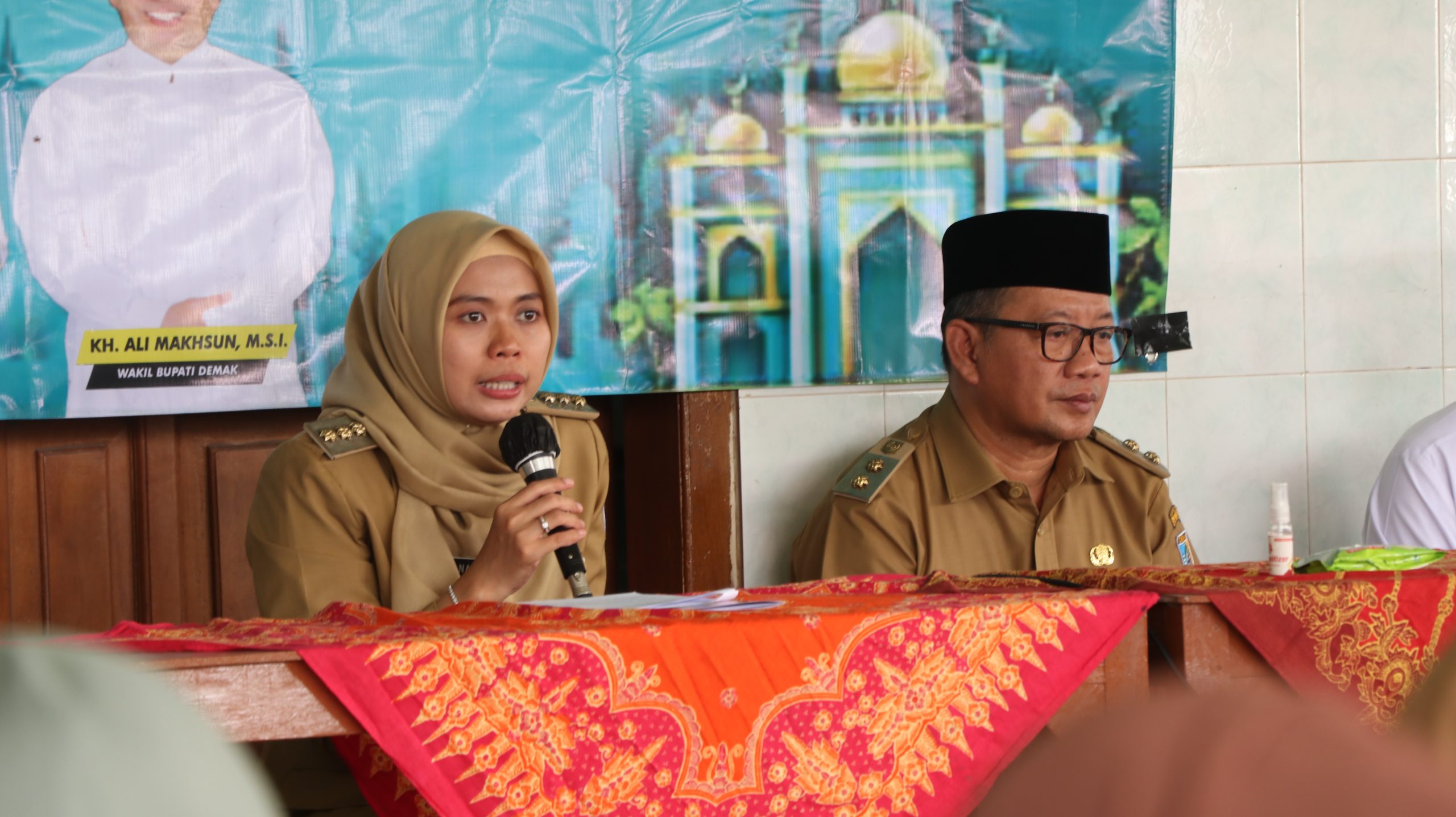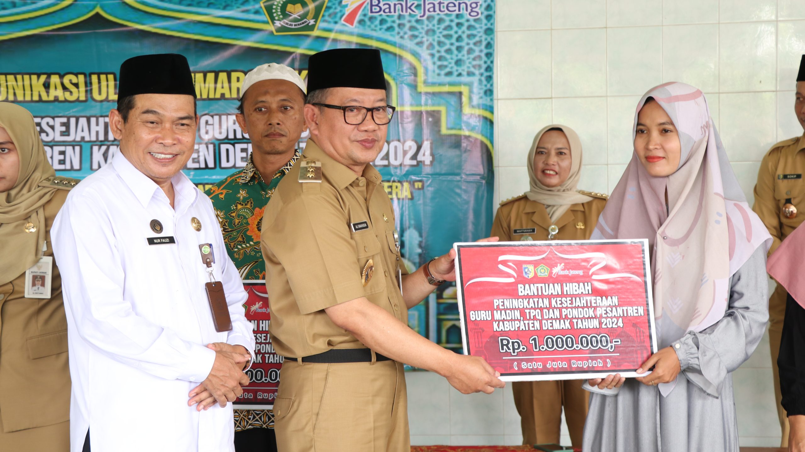 Bantuan diserahkan secara simbolis oleh Bupati Demak Eisti’anah, Wakil Bupati Ali Makhsun, dan Staf Ahli Setda kepada Guru Madin dan TPQ.