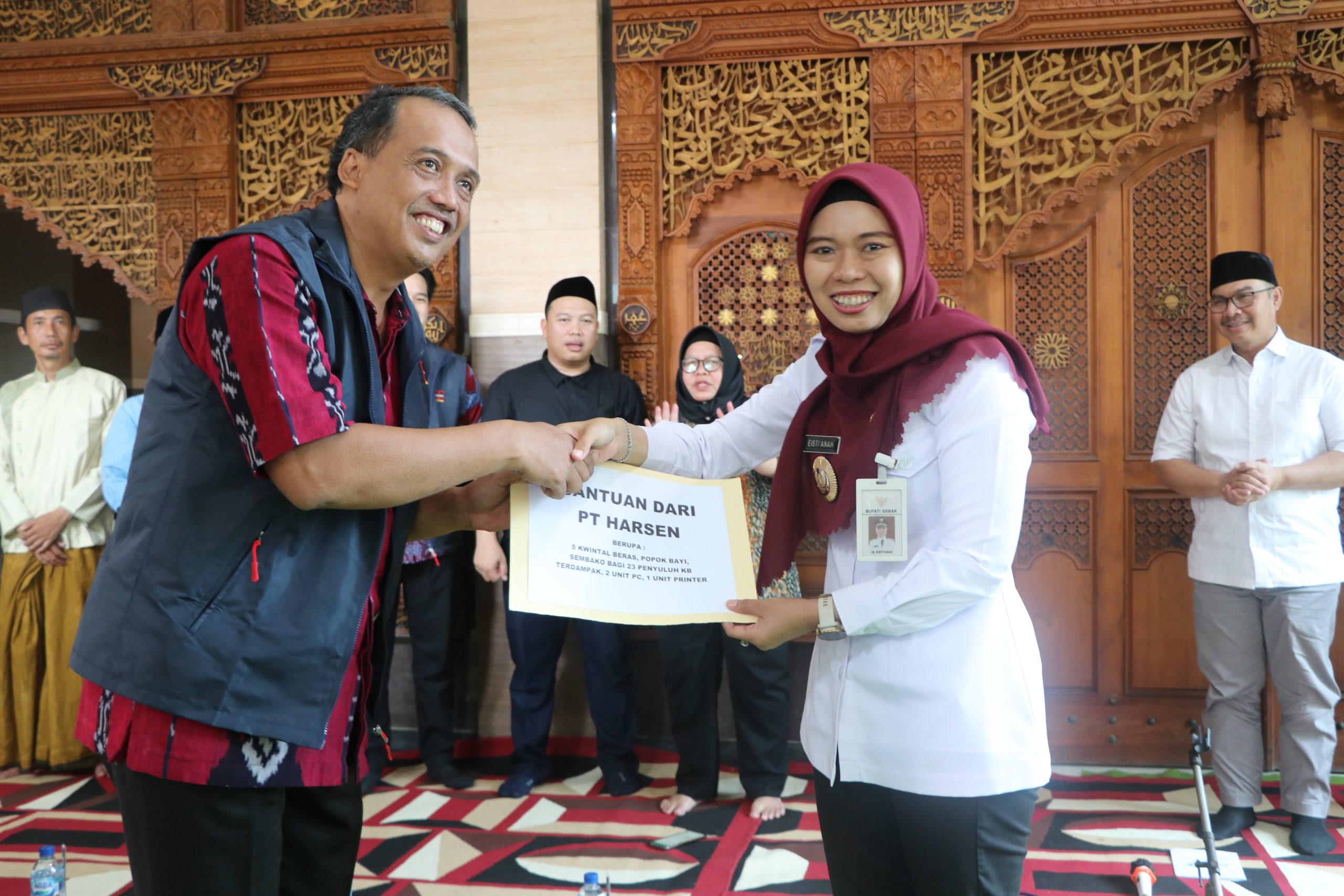 Setelah itu, dilanjutkan dengan penyerahan bantuan dari PT Harsen Laboratories diterima oleh Bupati Demak berupa 5 kuintal beras, 2 unit pc, 1 printer, Popok bayi, 23 sembako untuk penyuluh kb, dan dari BKKBN berupa paket bantuan dan susu UHT.
