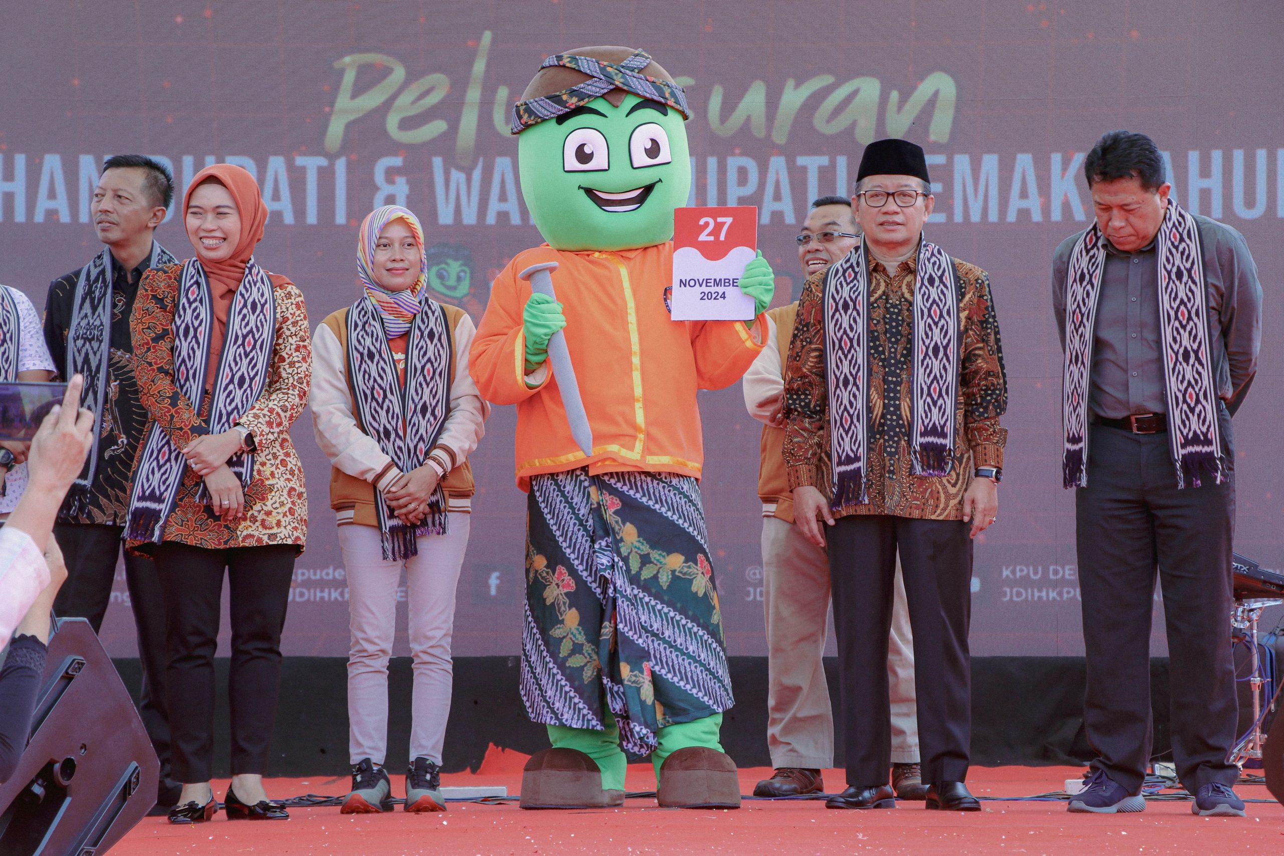 Acara yang digelar Komisi Pemilihan Umum (KPU) Kabupaten Demak tersebut ditandai dengan diperkenalkannya maskot Pilkada Demak 2024 bernama Brayo yaitu buah dari tanaman mangrove khas pesisir pantai Demak. (Prokompim)