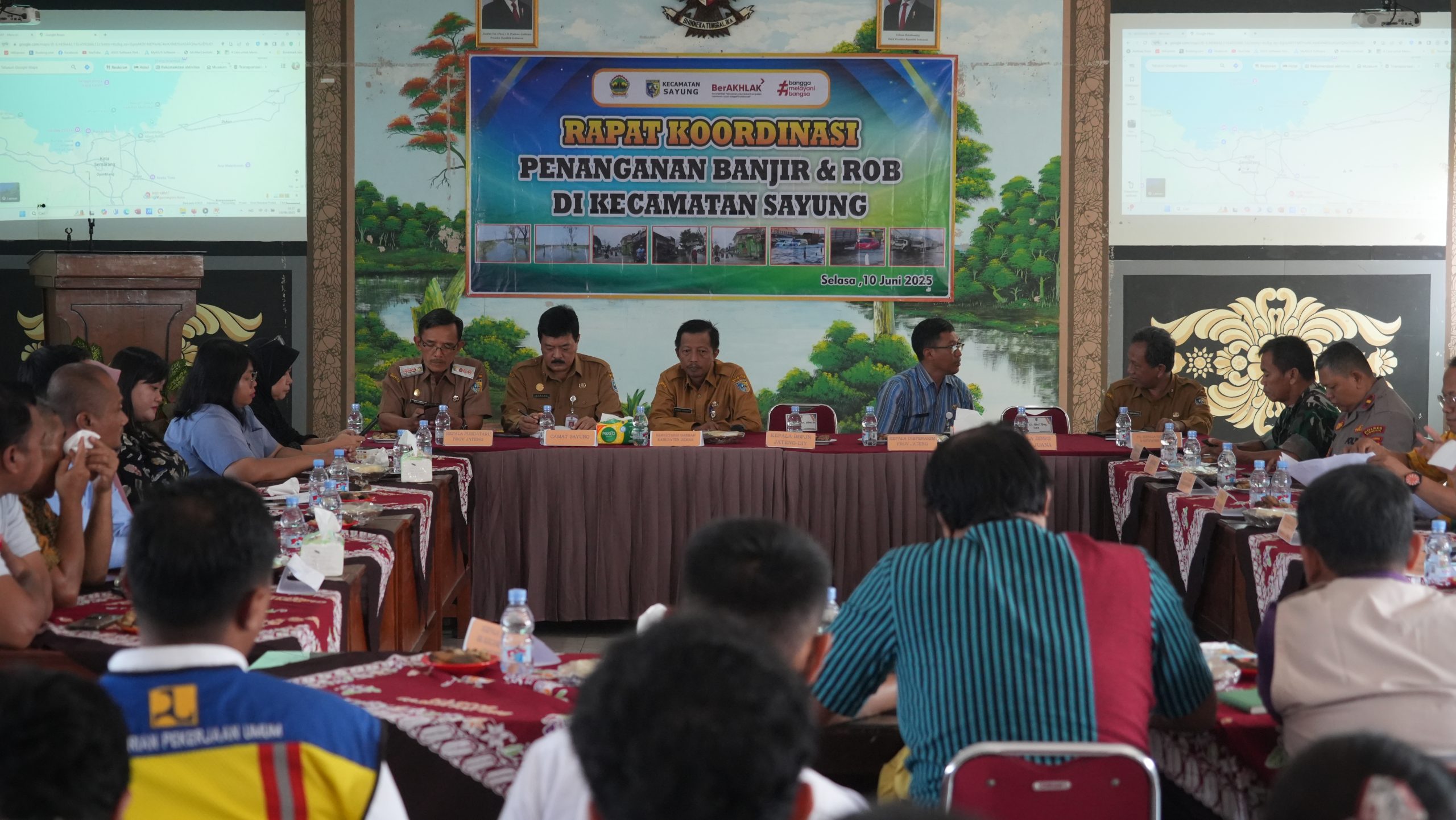 Pemerintah Kabupaten Demak kembali menggelar rapat koordinasi lintas sektor dalam upaya mengatasi persoalan banjir rob yang selama ini melanda kawasan pesisir utara, khususnya Kecamatan Sayung. Rapat yang berlangsung pada Selasa (10/6/2025) di Aula Kecamatan Sayung ini dihadiri oleh berbagai pemangku kepentingan, mulai dari unsur pemerintah, TNI/Polri, hingga perwakilan perusahaan yang beroperasi di kawasan terdampak.