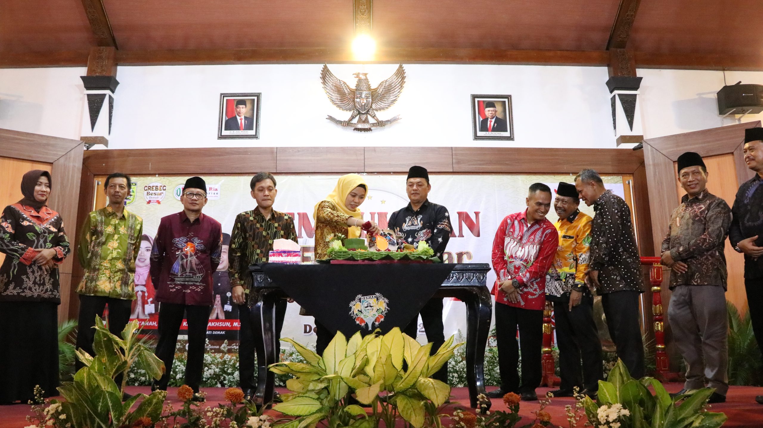Bupati Demak Eisti’anah memukul gong serta memotong tumpeng sebagai penanda dibukanya Grebeg Besar dan Pasar Rakyat di Panggung Kesenian Demak, Taman Tembiring Jogo Indah, Jumat (31/05/2024) malam.