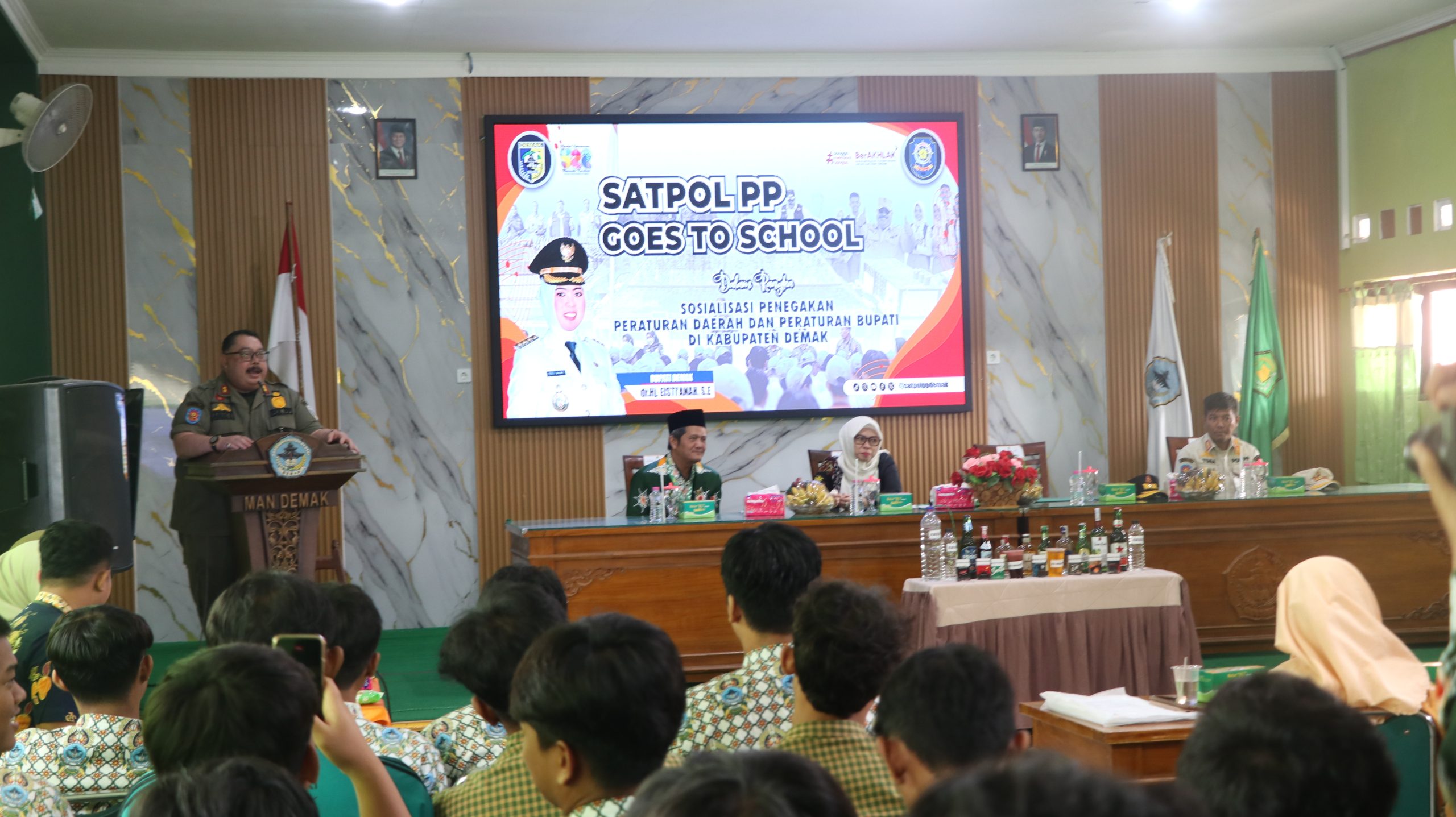 paten Demak melalui Satuan Polisi Pamong Praja (Satpol PP) menggelar kegiatan Satpol Goes to School dengan tema sosialisasi penegakan Peraturan Daerah (PERDA) dan Peraturan Kepala Daerah (PERKADA), Kamis (5/2/2026) di MAN Demak. Acara ini dipimpin langsung oleh Bupati Demak, dr. Hj. Eisti’anah, S.E., dan dihadiri jajaran Satpol PP, guru, serta ratusan siswa MAN Demak.